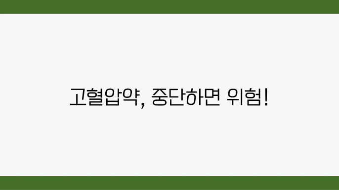 | 고혈압약 중단 시 문제점 | 혈압이 급격히 상승하며 심혈관계 위험 증가 | 재발성 고혈압 수치 증가 (+20mmHg 이상) | 병원에 즉각적인 의료 상담이 필요 |