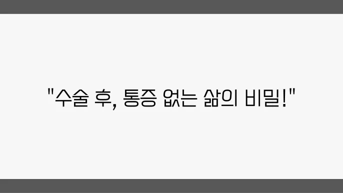 수술 후에는 무엇보다도 편안한 회복 환경을 만드는 것이 중요합니다. 자신의 몸의 반응을 잘 살펴보고, 필요할 경우 전문가의 조언을 즉시 받는 것이 좋습니다. 회복 속도는 개인마다 차이가 있기에, 무엇보다도 인내심을 가지고 기다리는 것이 필요합니다. 통증이 있을 경우 과도한 활동은 피하고, 조절 가능한 범위 내에서의 생활을 유지하세요.