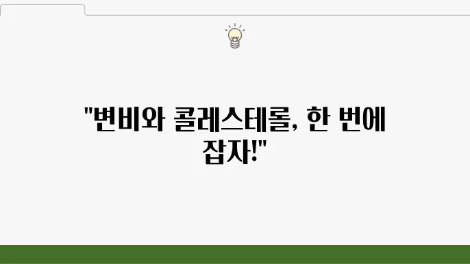 위에서 설명한 다양한 식품들은 **변비 개선**, **콜레스테롤 감소**, 그리고 **항산화 성분**攝取에 효과적입니다. 이러한 식단은 단순히 건강을 유지하는 데 그치지 않고, 전반적인 삶의 질을 향상시키는 데 기여합니다. 식이 섬유가 풍부한 음식을 우선적으로 섭취하고, 건강한 지방과 단백질을 고루 포함한 식단을 유지하는 것이 중요합니다. 이러한 습관이 어려울 수도 있지만, 건강을 위해서는 지속적인 노력이 필요합니다. 매일 조금씩 건강한 음식을 섭취하면서 변비와 콜레스테롤 문제를 예방하는 것이 가능하다는 사실을 잊지 마세요.